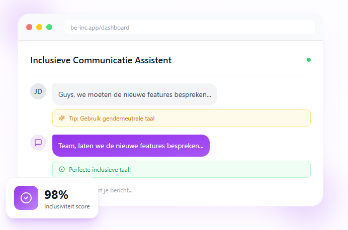 Generieke AI is gemaakt op publiek internet – vol bias, onbetrouwbare data en onvoorspelbare outputs. Be-Inc is gebouwd op organisatiecontext, beleid en Europese richtlijnen, zodat teams altijd helder, inclusief en compliant communiceren.